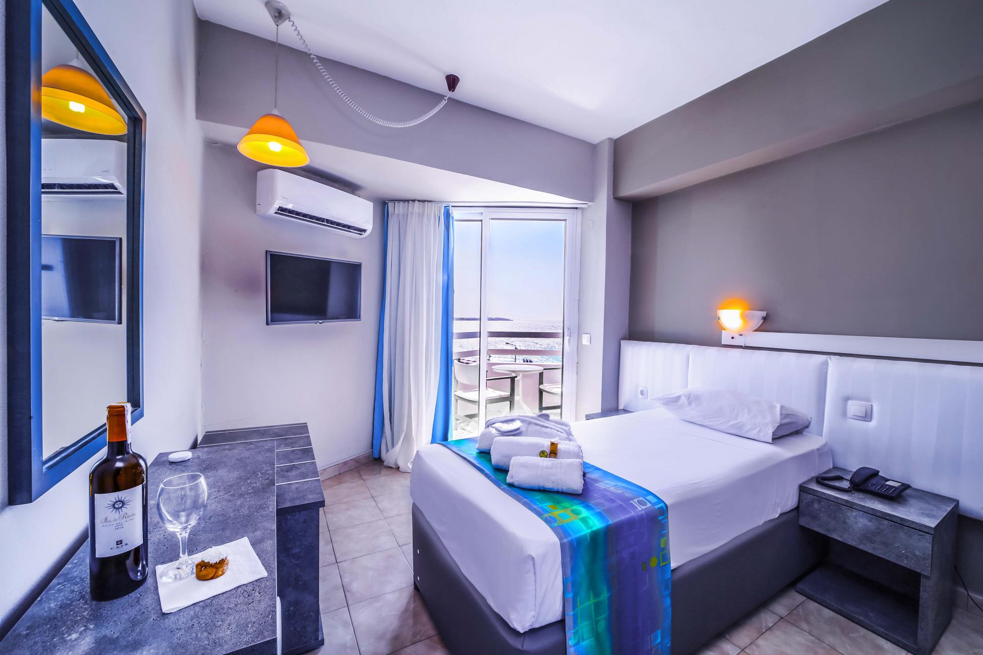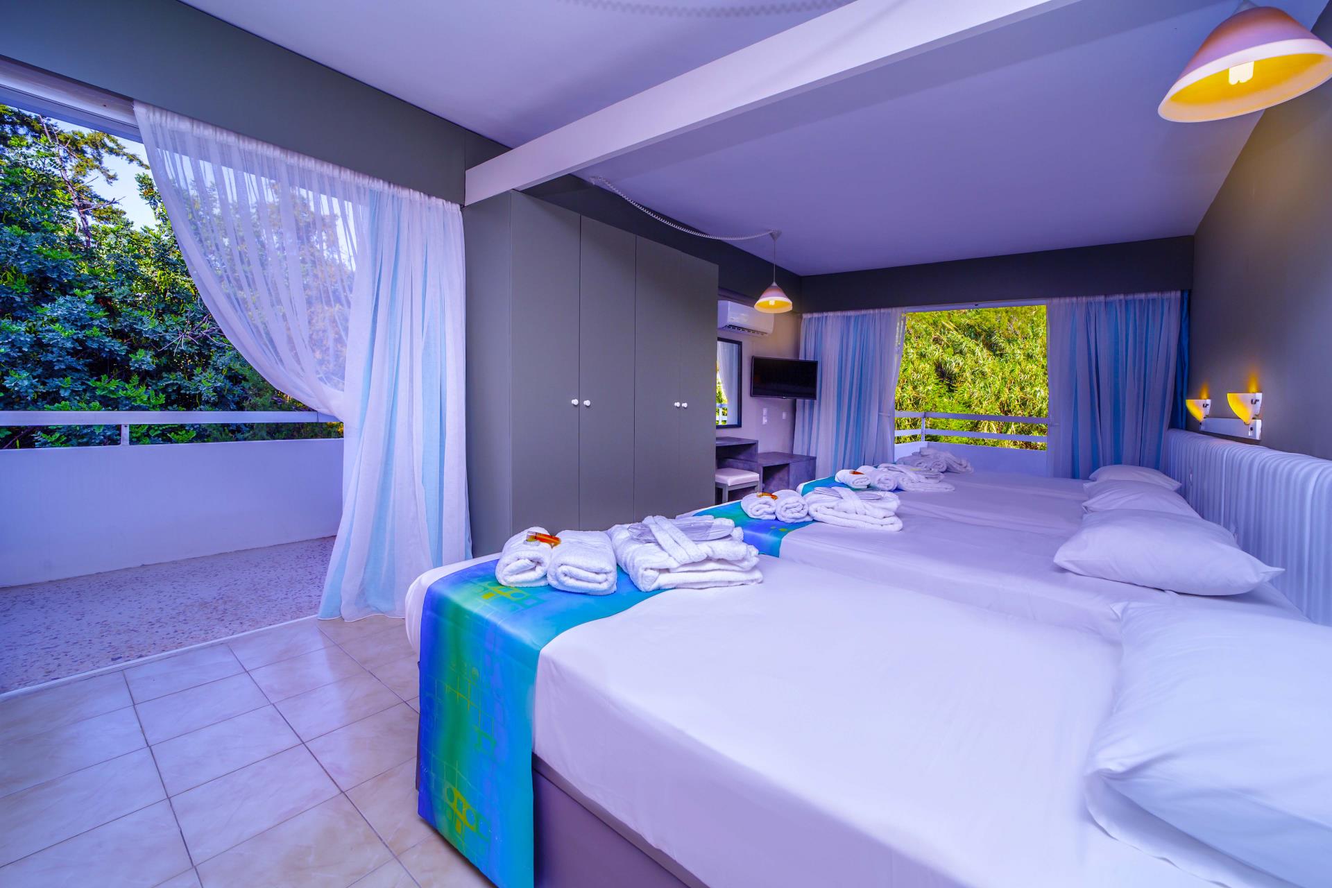 The rooms at Lito Hotel have a balcony enjoying views to the pool, the garden or the Aegean Sea. Each is fitted with a satellite TV, a mini fridge and a marble bathroom with bathtub or shower.