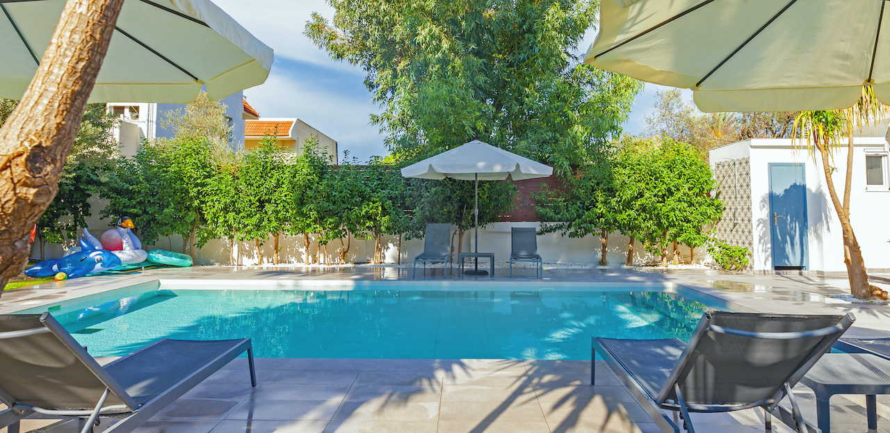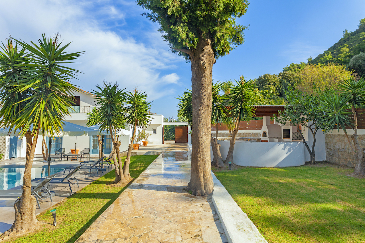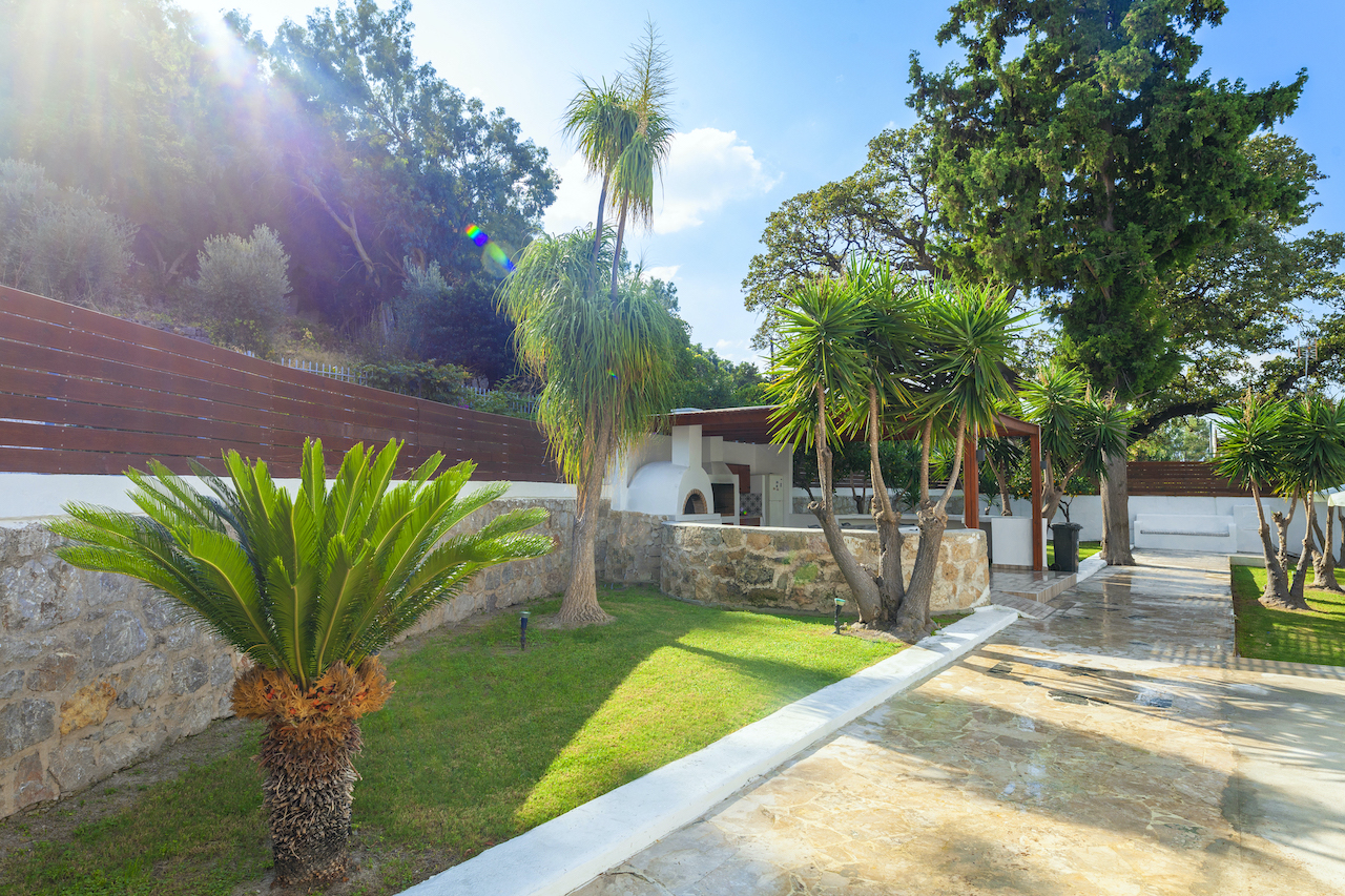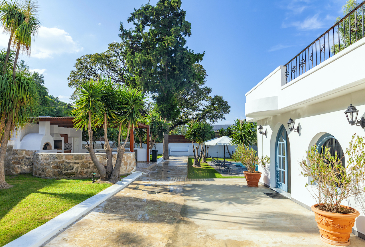 Authentic Greek architecture pairs beautifully with modern amenities in this gorgeous luxury villa rental in Ixia Rhodes.