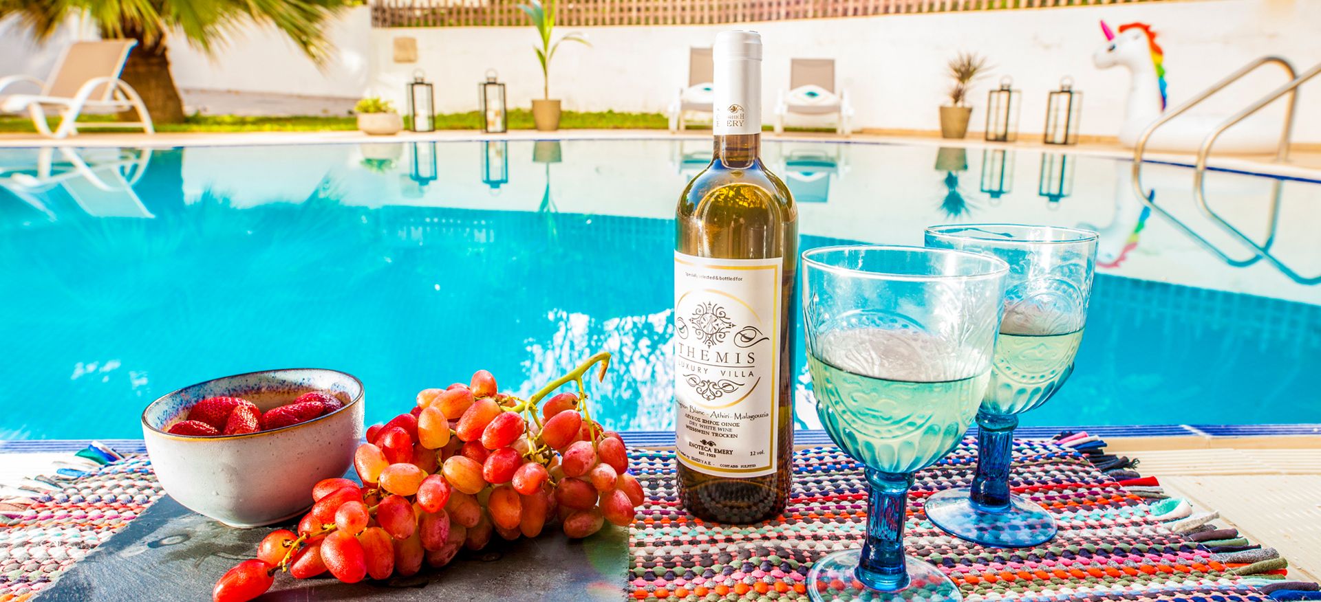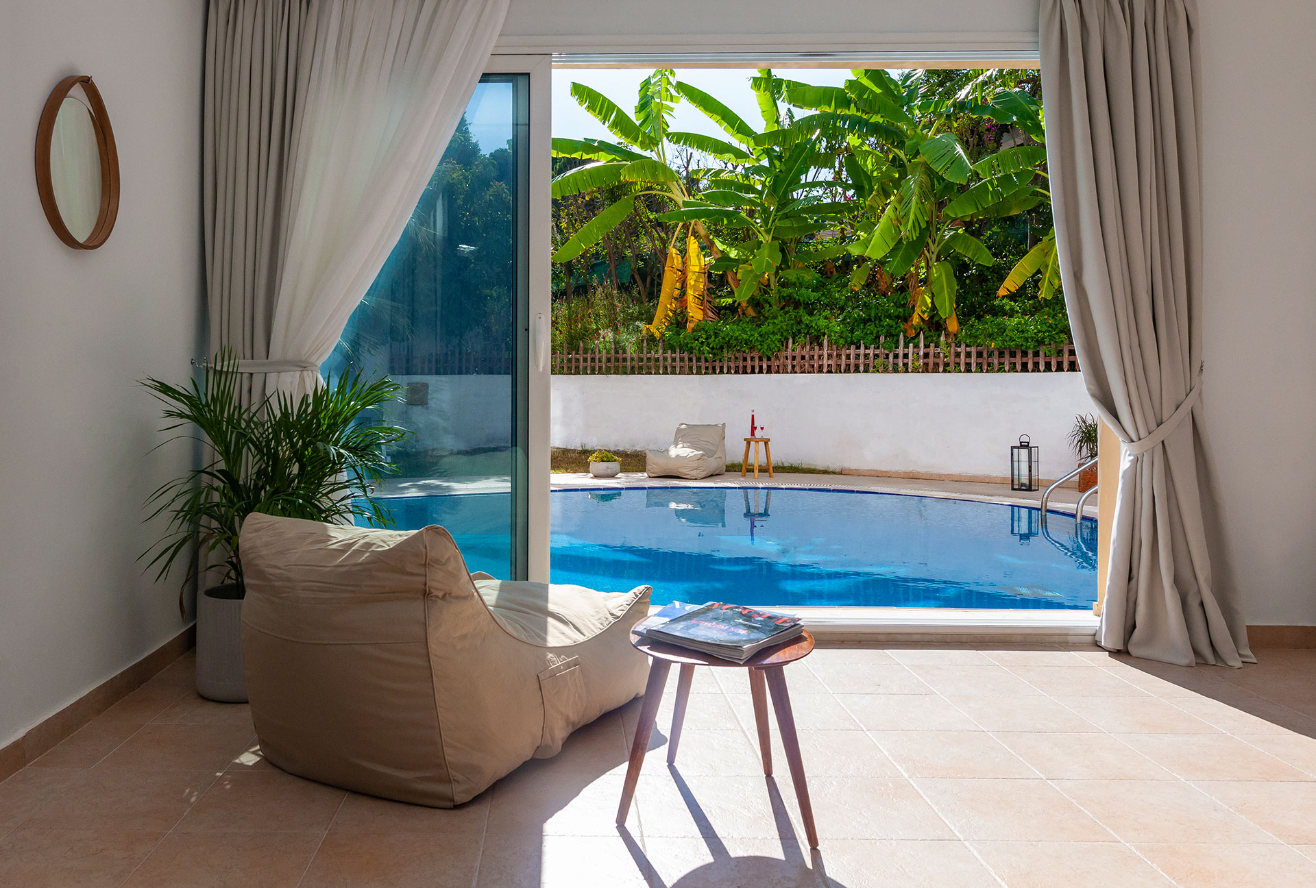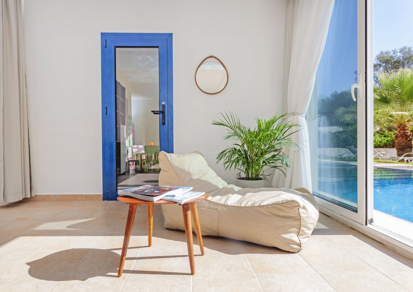 Dip your feet in the swimming pool and enjoy a delicious cocktail, or taste our own wine label by the pool. Revel in the turquoise waters and relax on the sun-loungers while admiring the view of the natural landscape. Our Jacuzzi corner, located in the master room, offers the ultimate invigorating experience for guests who are looking for some extra pampering throughout the day.