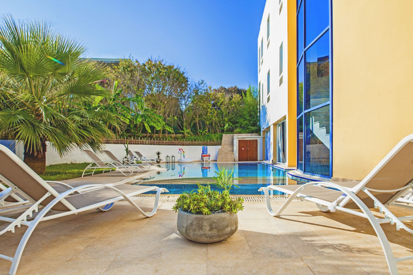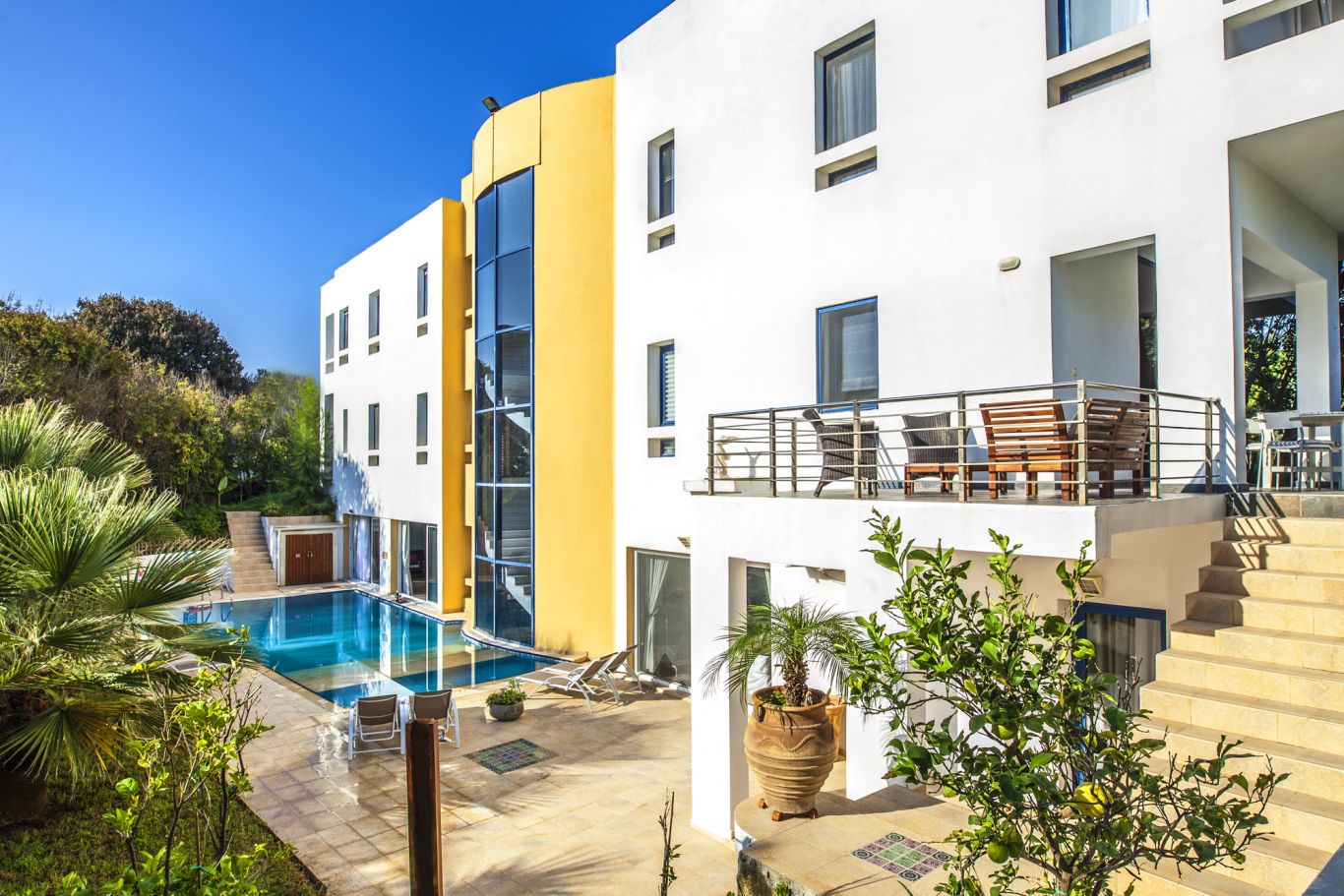 In a peaceful neighborhood at beautiful Ixia of Ialysos, just a few kilometers away from the center of Rhodes lies Themis Private Villa. The villa offers smooth access to nature, as it nestles near the imposing Filerimos mountain, where you will enjoy strolling up the hill and gazing at stunning panoramic views of the Aegean Sea from its top. Surrounded by a large beautiful garden and a lush green lawn full of trees, the three-floored villa comprises five luxury suites, perfect for families or a group of friends.
