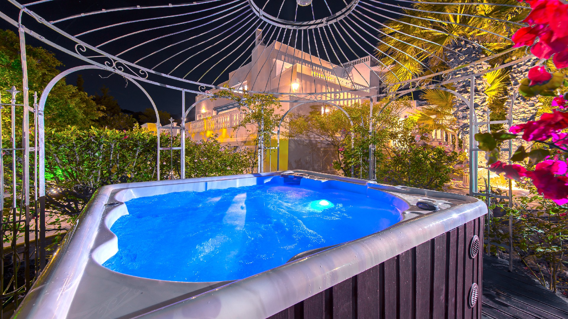 The Villa, the garden , the pool area and the Jacuzzi, stand out after sunset with a luminous glow, creating magnificent scenery for socializing, partying, relaxing or having a drink, hearing the running water from the fountain and admiring the spectacular changing colors of the pool. The Journey through the countless stars of the night sky with the moon to keep you company till dawn. The villa is ideal for organization of various events, Wedding Receptions, Engagement Parties, Birthday Parties , Children parties .