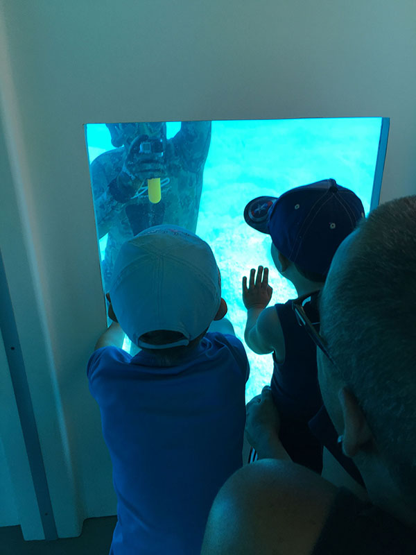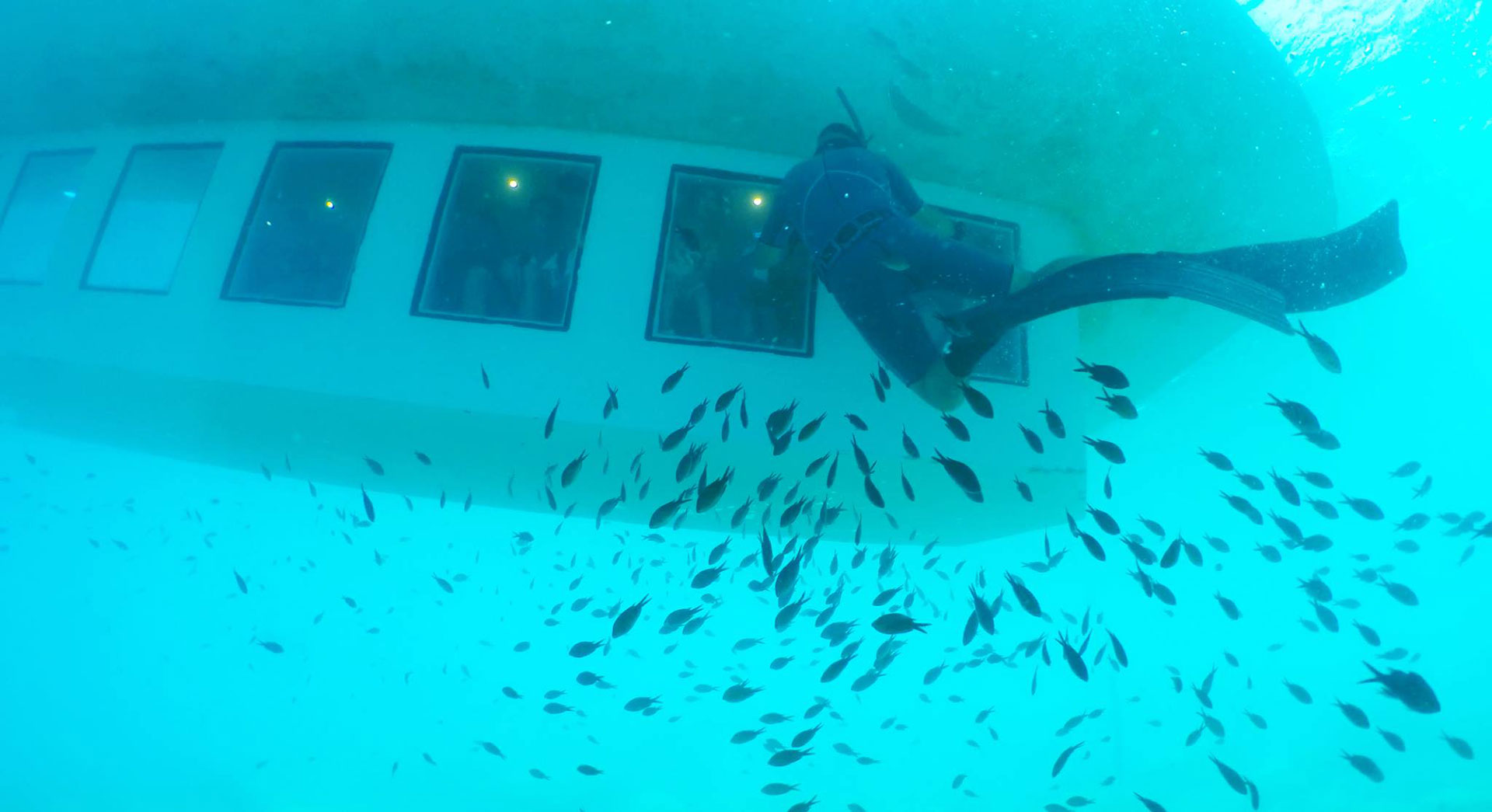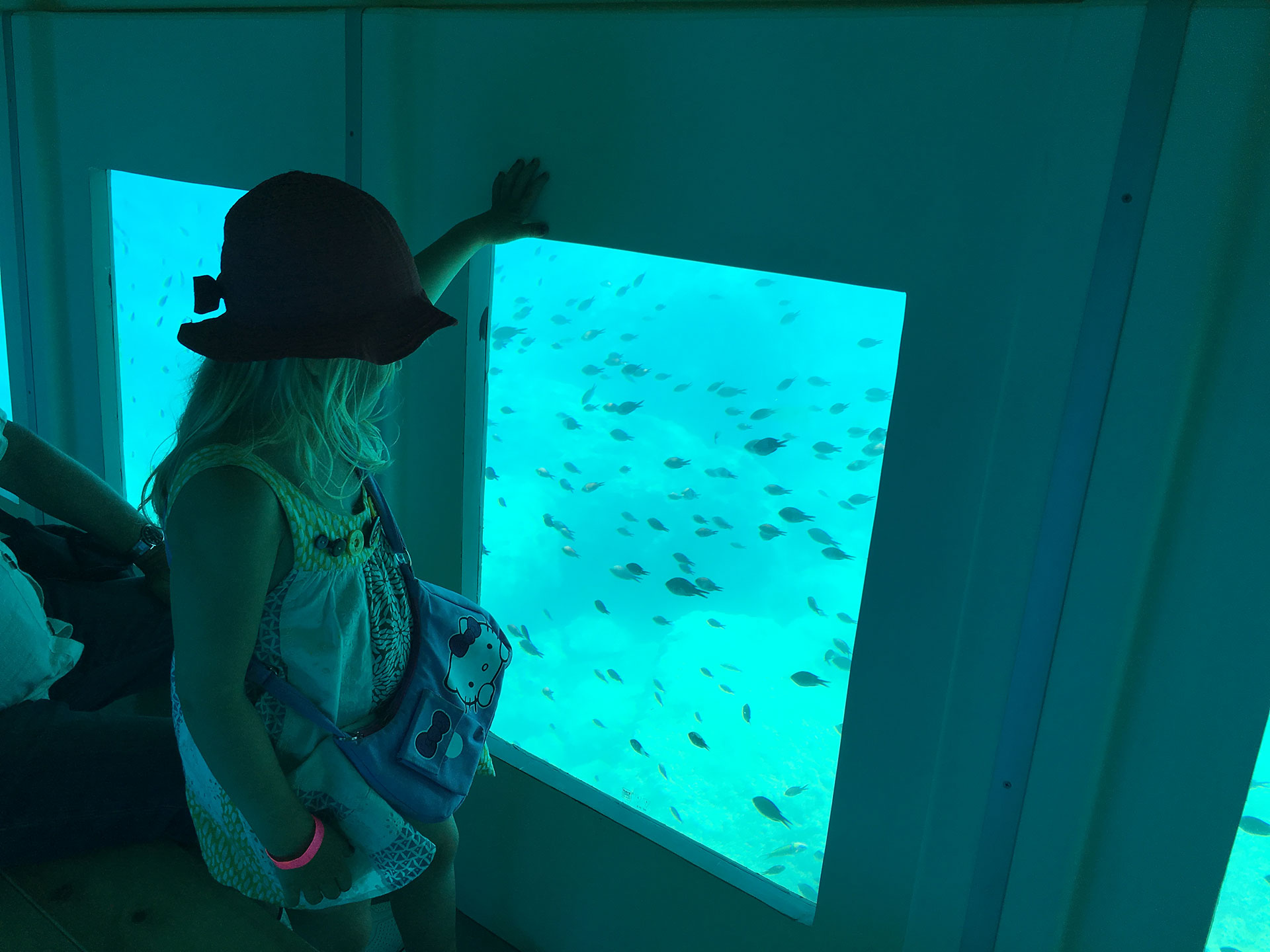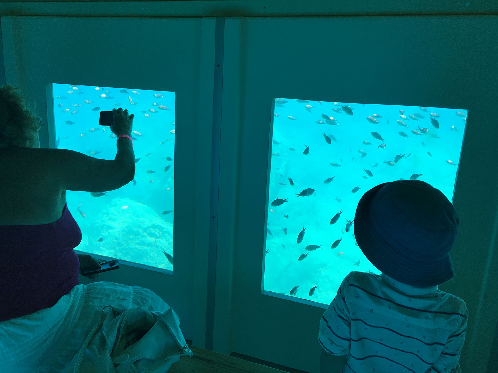 Sitting in an air-conditioned comfort cabin below the surface, and gaze out of the huge windows which offer you a 360° panoramic view of the stunning eco-systems of the Aegean Sea. Be sure to have your cameras ready when our diver enters the water and begins to feed the hundreds of multi-colored fish right in front of your window. This is a great experience for nature lovers of all ages and the the expert crew will take care everything. The vessel remains above sea level at all times, while its hull, the underwater observatory, is 2.5 meters below the surface. Have the option to relax surrounded by the underwater world or leave the cabin and walk on the deck and enjoy the ocean breeze.